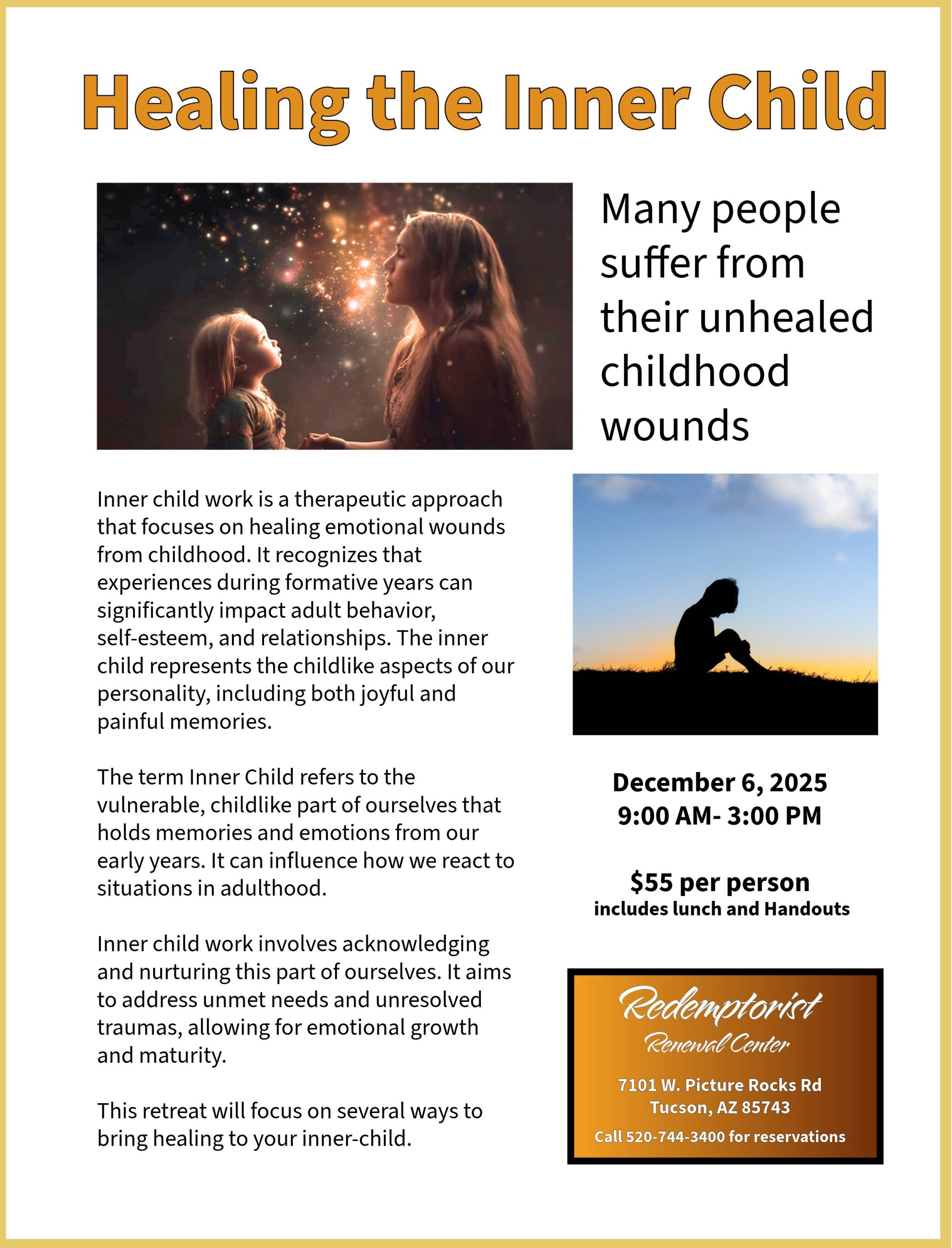 Fr. Charlie also sponsors a Codependents Anonymous support group called SoulShine.  The group meets at the Center in the Meeting Room near the Dining Room “Ocotillo” every Wednesday night from 6:00 – 7:00 PM.  This is an open group that reads from various recovery books and then opens the floor for personal sharing.  Although this is primarily a codependency group, it is open to anyone suffering from addictive behaviors.  Addictions are symptoms of a deeper problem, that problem being “I don’t love who I am.”  We try to get to the root cause of “acting-out” by helping each other to develop self-understanding and self-love.